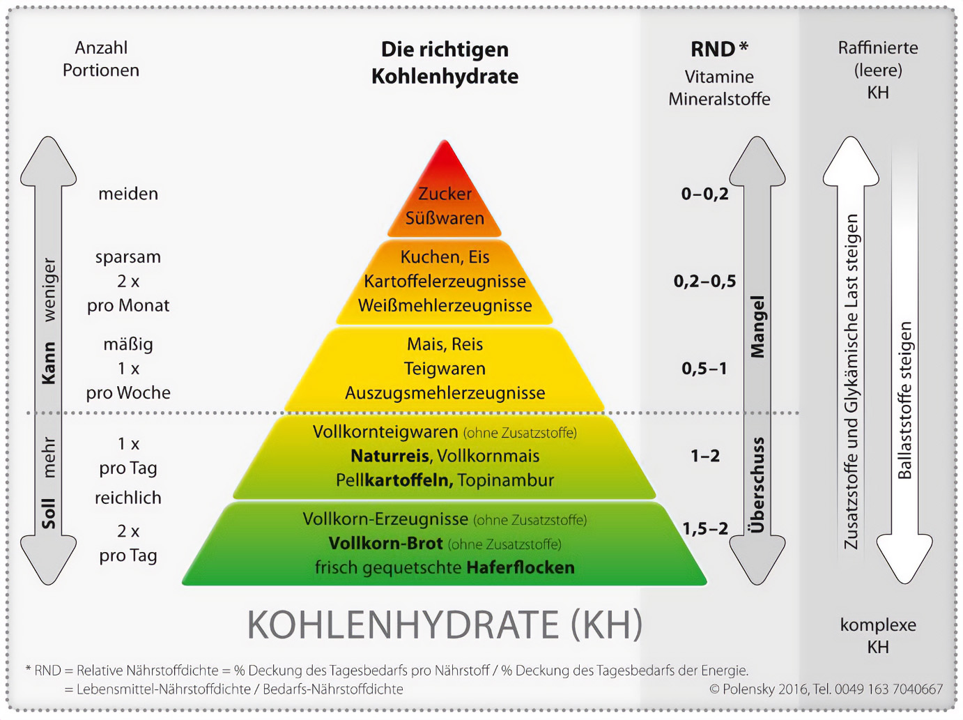 Getreide, Kartoffeln und Zucker weisen eine hohe Energiedichte auf. Bei Getreide und Kartoffeln deckt eine Portion zwischen 7 und 10 % des Tages-Energiebedarfs. Es ist wichtig, darauf zu achten, nur Lebensmittel aus der Basis Pyramide (grüner Bereich) mit RND Kennziffern grösser 1 zu verzehren. Produkte aus der Spitze der Pyramide (roter Bereich) mit RND-Werten kleiner 0,2 sollten wir tunlichst vermeiden. Alle dazwischen liegenden Lebensmittel verwenden wir am besten sparsam.
